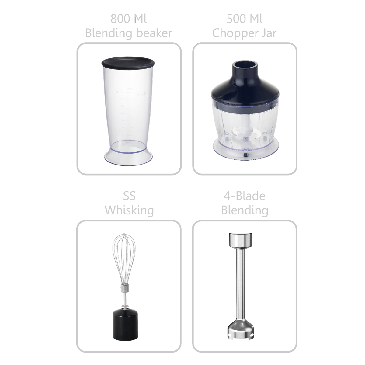 4-IN-1, 304 GRADE STAINLESS-STEEL STICK BELNDER WITH 0.5L CHOPPING BOWL, EGG WHISK, BPA-FREE, 400W